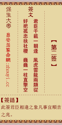 卦中第一、一路亨通。从心所欲、诸事皆吉。风调雨顺、金城汤池。财源巩固、客路雍熙。应试如意、结婚齐眉。此签既得、事事咸宜。