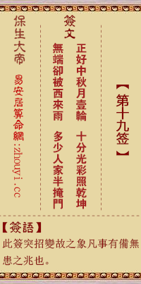 天有不测风云,人有旦夕祸福;事业正楚于颠峰状态,无缘无故来个突发事故,使多年的心血废之一旦,要如何避过风险,看自己智慧之如何运用了。此签是由正转负之兆,要小心经营,以防突发事故。