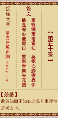 向神明祷告,抽取灵签,表面上是为你祷告祈福,目的是为排除异己,你要小心知道。不要以为他是大恩人,感谢他、相信他,把心都偏向他。他是蛇身虎口,笑里藏刀,表里不一的阴险小人,想从你这边得到好处。
