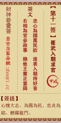 霹雳风雨雷电过后,天忽然放晴开朗,那一阵暴风雨像是洗净了世间的尘埃,既知虎穴山头有老虎,就不必冒险偏向虎山行,既然有鲤鱼跳龙门的机会,就不要错过,快向龙门跳出来呀!这是一首很吉利的签诗,尤其是问考试,有金榜题名之兆,签诗用“崔武入朝求官”的故事,暗示当事人,必须心怀大志,为人服务,只要忠贞,虽事有重险,心却平康,凡事先难后易,必须积极努力进取,始有成功的果实。