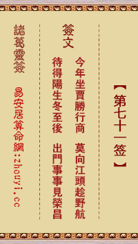 诸葛神签第70签概述和签图 第七十首。 许汝三天有顺风、开船平稳任西东、财源辐辏何须说、一路荣华命运通。 辐辏:形容人物很密的聚在一起。 骈臻:到达并列。 咸亨:易经卦名,喻吉象。 诸葛神签第70签吉凶解签 功名:功高名显、一路荣华。 行人:三日之内……